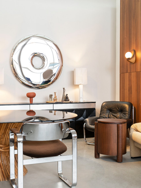 De kracht van Cocoon House zit in de combinatie van toen en nu. Vintage stukken en hedendaags design versterken elkaar en maken de collectie gelaagd en spannend. Denk aan de indrukwekkende spiegel Rondo van Oskar Zieta gecombineerd met een werk van FranƧoise Jeffrey en de iconische Silver Chair van Eero Aarnio uit 1969.